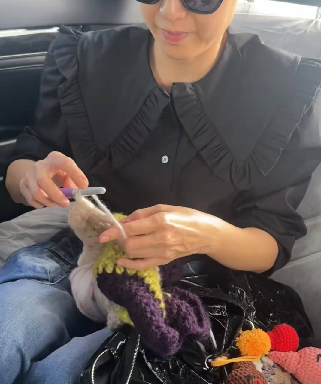 坐车期间,甘比无聊,很自然地拿出毛线“动起手来”,她可能没有化妆,让助手拍照时,她在车内都戴着墨镜,也不知道能否看清楚毛线。